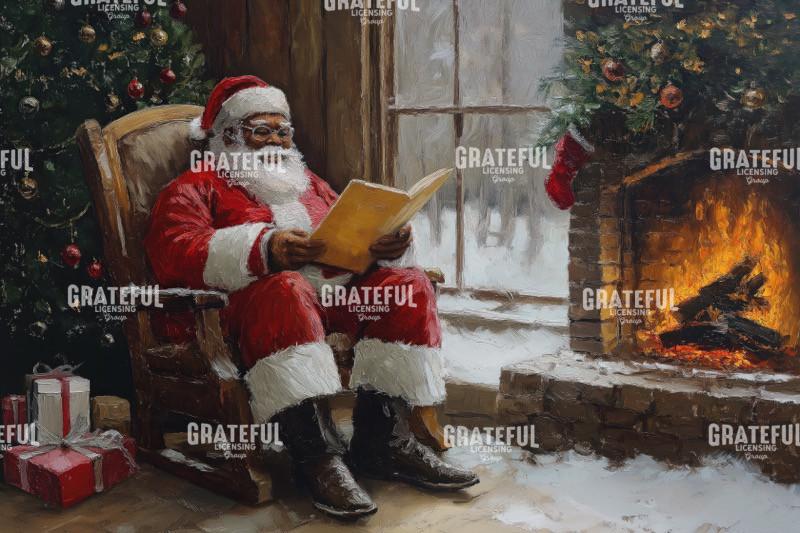 Tags: black santa, book, Christmas, decorations, fire, fireplace, gifts, glow, glowing, merry christmas, naughty list, nice list, presents, reading the list, tree