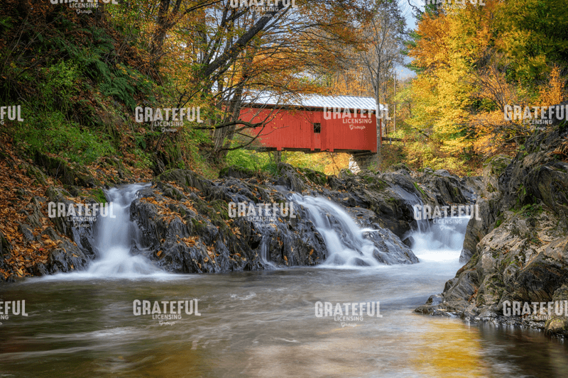 Tags: 1872, 19th century, autumn, bridge, covered, dog river, fall, foliage, Historic, house, leaf, leaves, new england, northfield, post, queen, red, reflection, river, slaughter, slaughterhouse, span, tree, truss, vermont, water, waterway