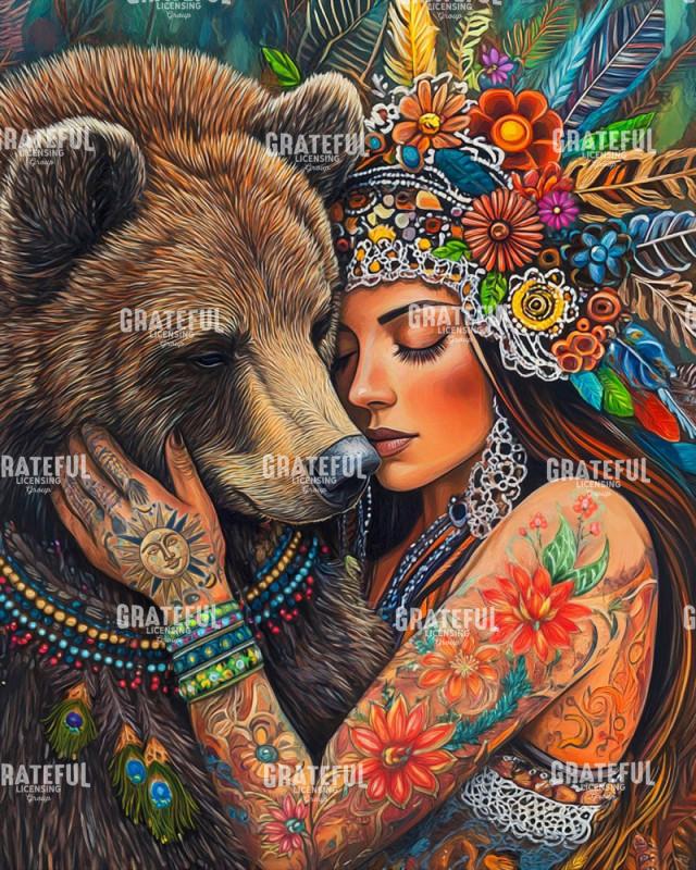 Tags: animal, beads, bear, colorful, floral headdress, flowers, puzzle, tattoos, Woman hugging bear