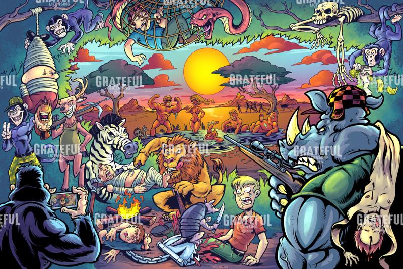 Tags: animals, animals fight back, colorful, Hunters in the Jungle Mural, jungle animals, lion, rhino