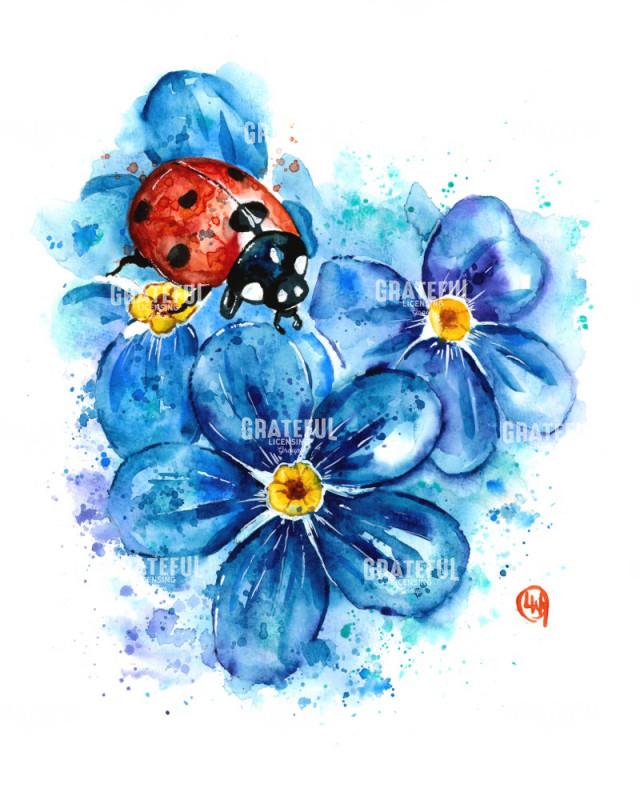 Tags: beetle, blue, blue flowers, bug, floral, ladybug, ladybugs, nature, plants, splatter paint, watercolor, yellow