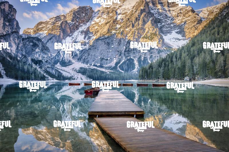 Tags: dock, Lago di Braies and row boats at sunrise in the Dolomites, lake, mountains, photograph, reflection
