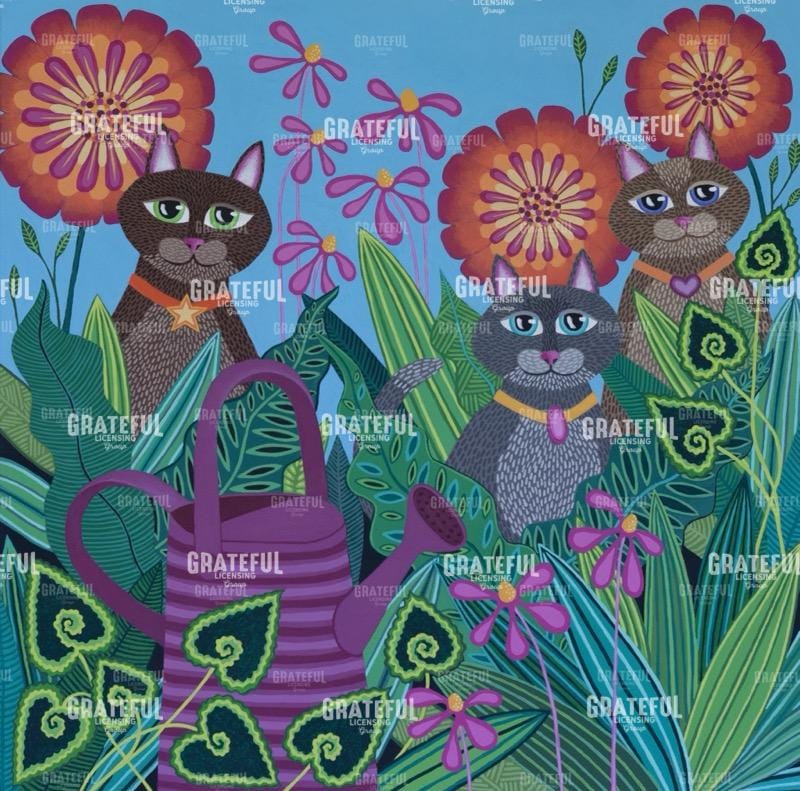 Tags: 3 cats, cat, color, feline, fern, Flower, flowers, folk art, friend, garden, green, greenery. blue, nature, purple, sunflower, watering can