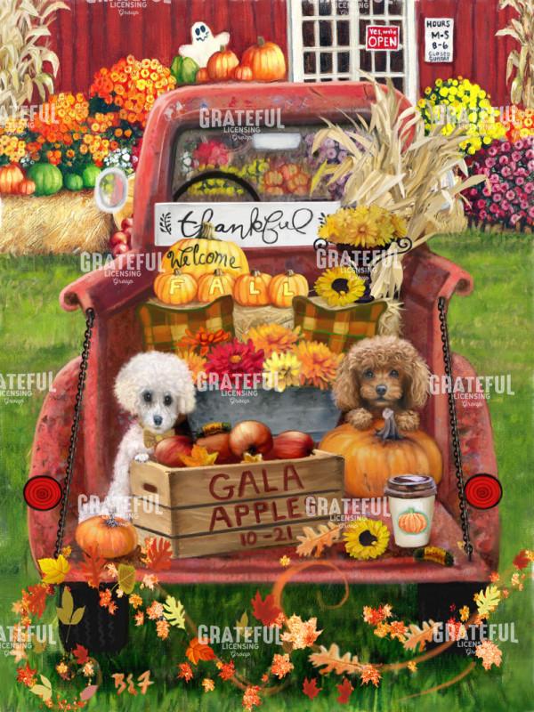 autumn, back, barn, bed, brown, country, dog, fall, Finally, leaves, mums, poodle, pumpkin, red, red truck, truck, white