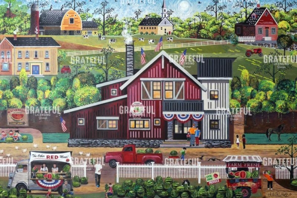 americana, barn, farm, farmstand, folk art, house, primitive, red truck, stand, summer, watermelon