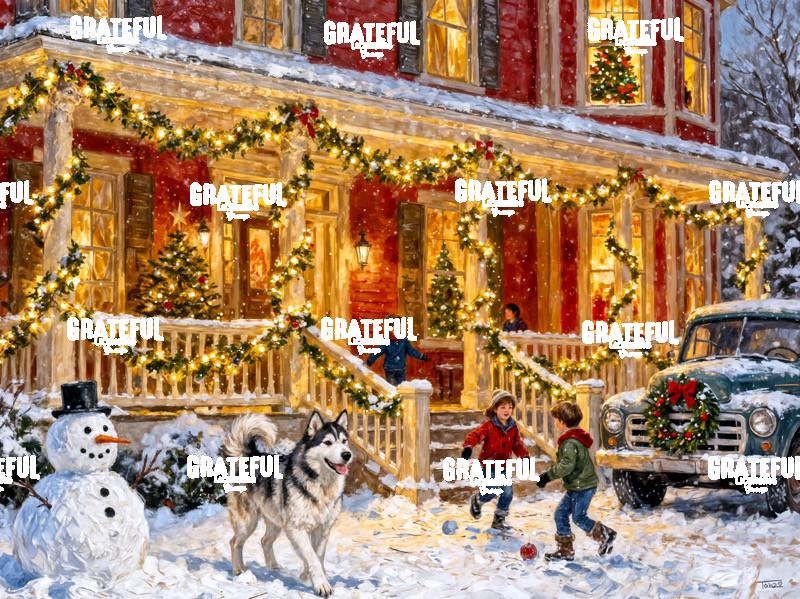 Tags: children, Christmas Eve, christmas tree, dog, illuminated, red house, snowman, truck, winter