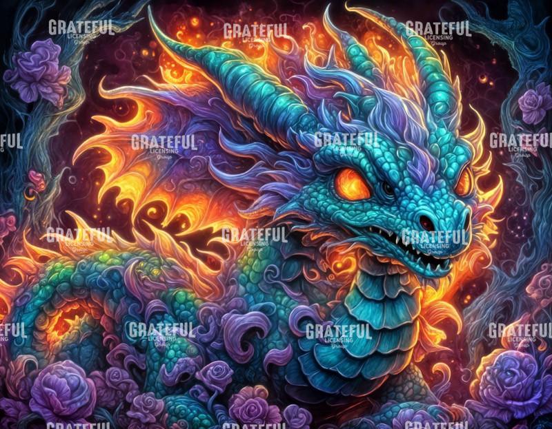 Tags: Dragon, fantasy, fire, glow, glowing eyes, green, orange, purple, teal, whimsical