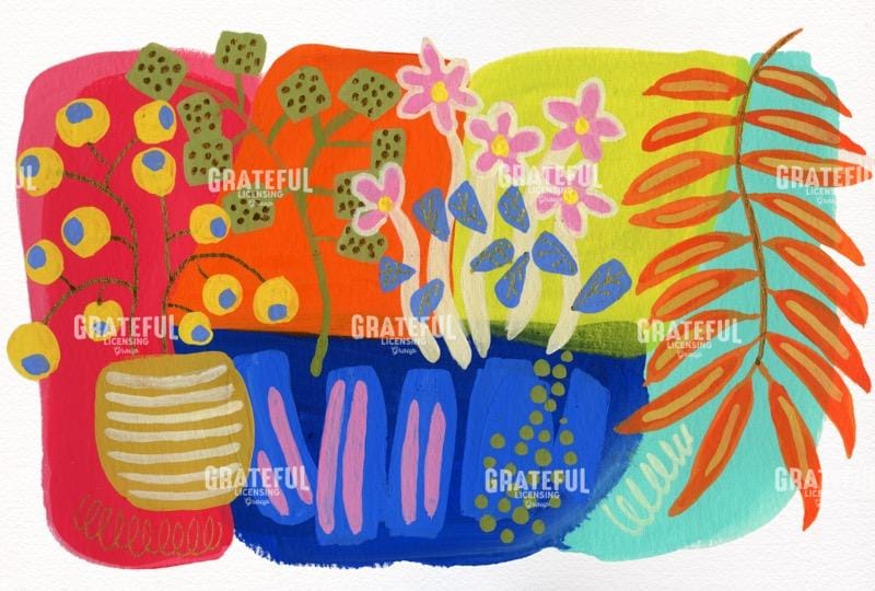 Tags: abstract, aqua, blue, botanical, color block, colorful, green, leaves, multi colored, orange, painting, plants, plum, rainbow, turquoise, vases
