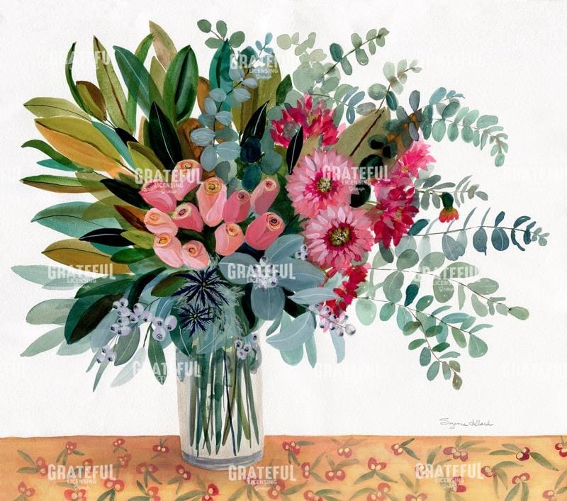 Tags: bouquet, bright, eucalyptus, floral, flowers, green, leaf, leaves, light, painting, pink, rose, tan, vase, white