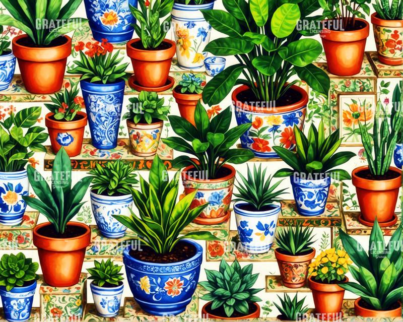 Tags: blue, green, orange, pattern, planters, plants, potted plants, terra cotta