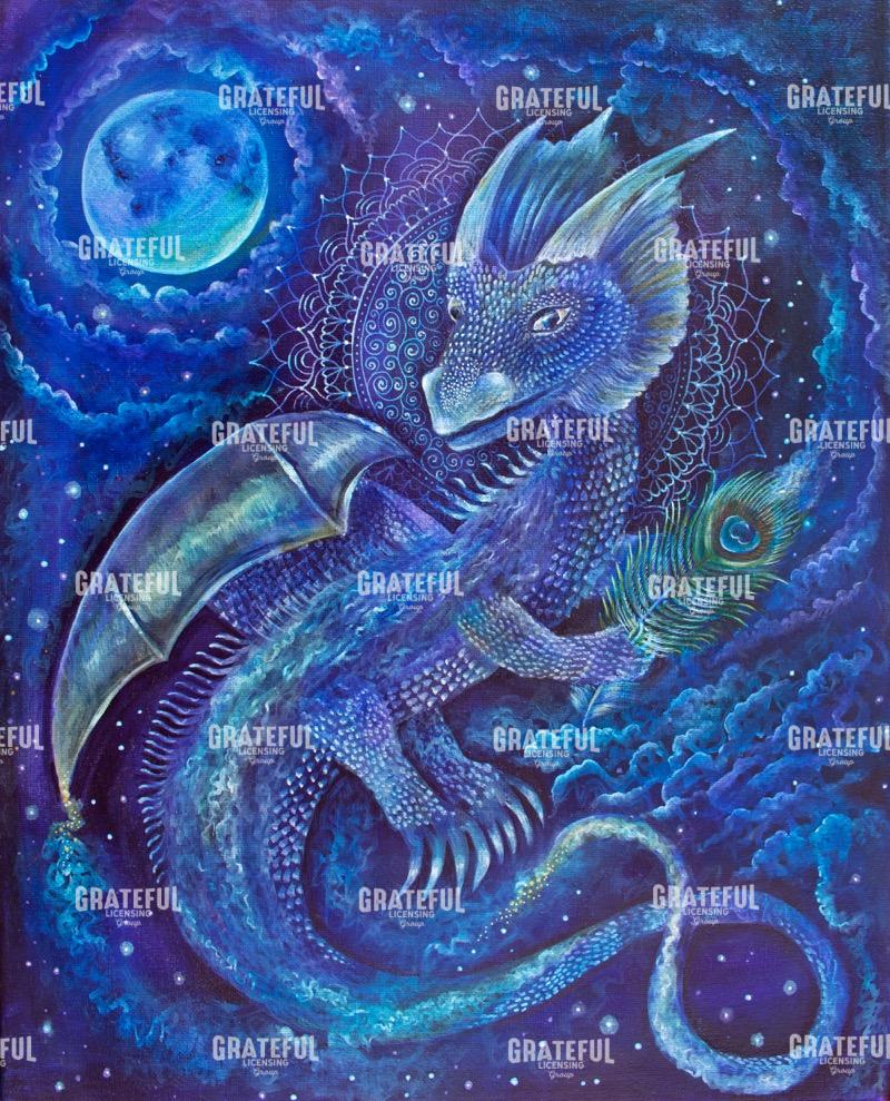 Tags: blue, claws, clouds, Dragon, full moon, green, moon, navy, night sky, nocturnal, painting, peacock, peacock feather, purple, stars, tail, wings