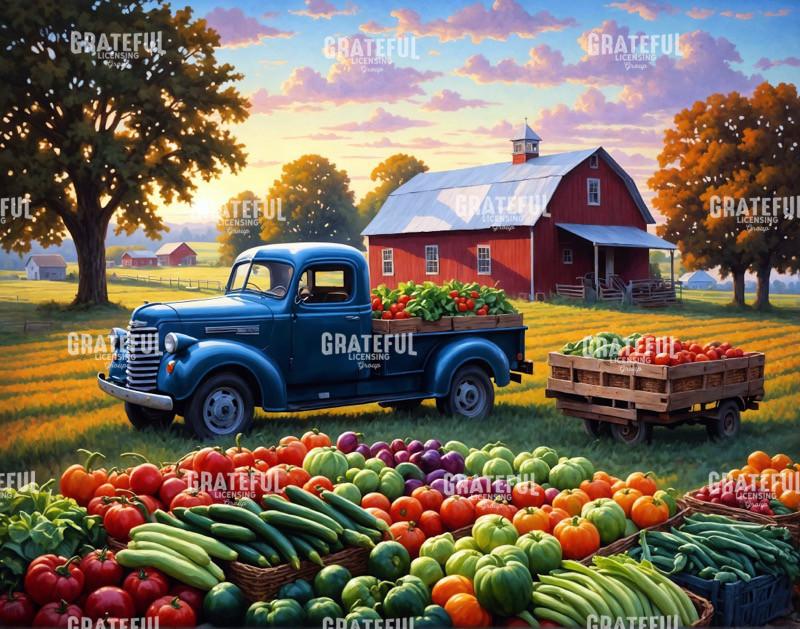 Tags: farm stand, landscape, red barn, retro, vegetables, vintage, Vintage Truck with Vegetable Cart