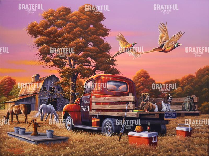 Tags: barn, ducks flying, farm, horses, Hunting dogs, old truck, red